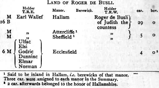 Grimesthorpe, Hallam, Attercliffe and Sheffield are described as being Terra Rogerii de Busli; but Hallam, Attercliffe and Sheffield were held as of the Countess Judith.